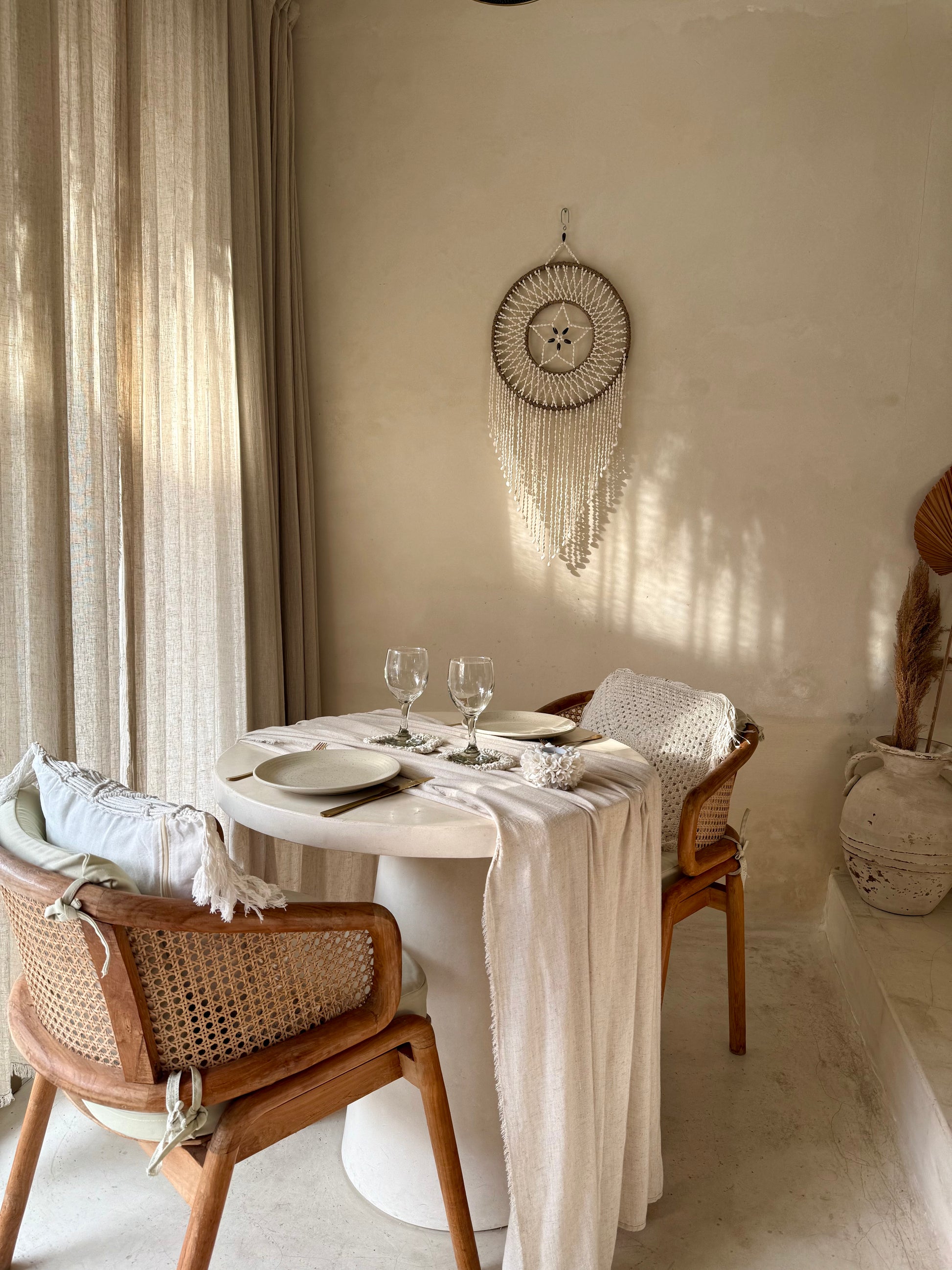 Les fils de coquillages suspendus apportent légèreté et mouvement, créant une ambiance bohème chic et apaisante.