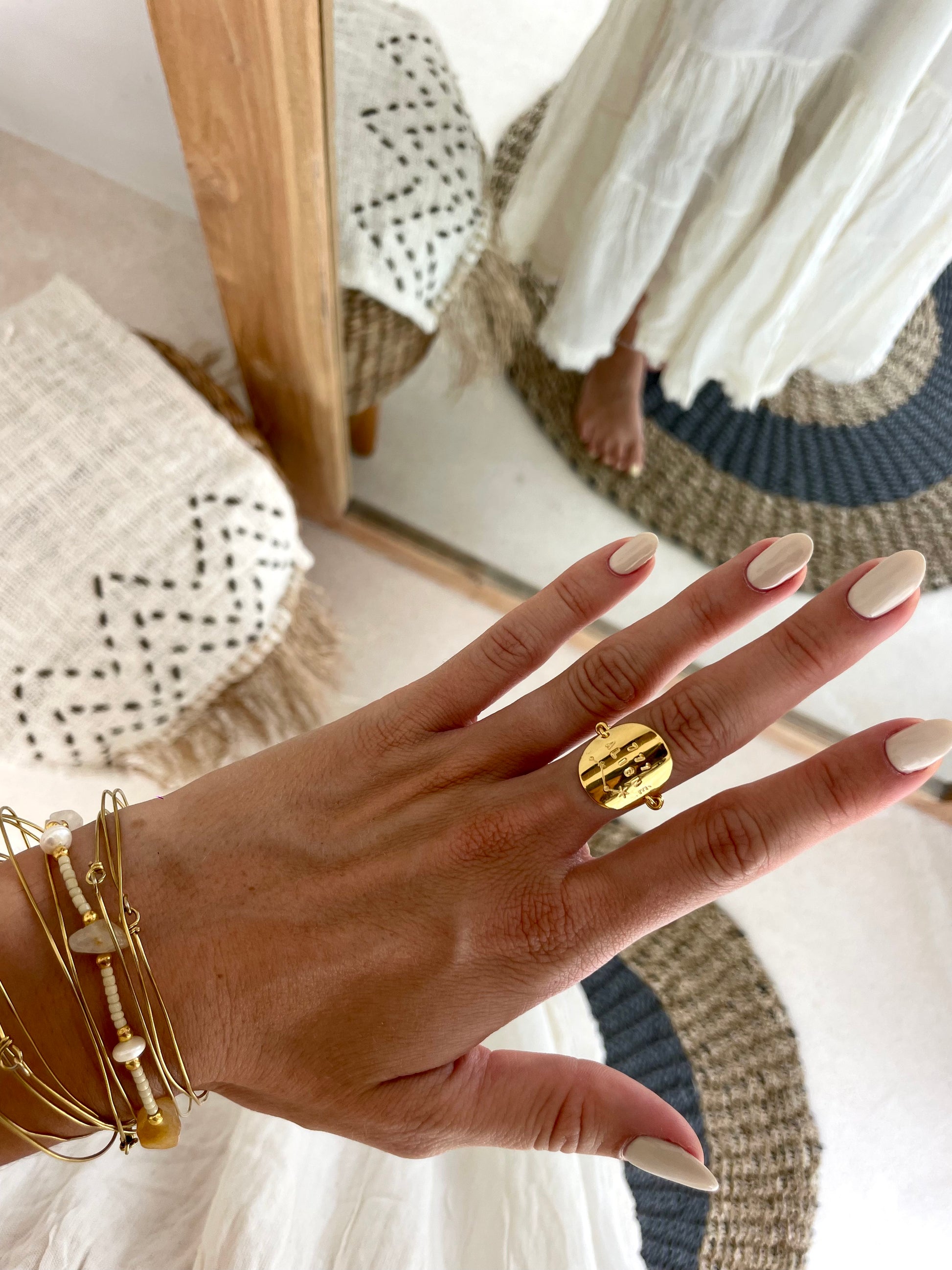 Son design unique se compose d’un médaillon rond légèrement courbé, qui suit naturellement la forme du doigt, relié par un anneau fin pour un rendu élégant et épuré.