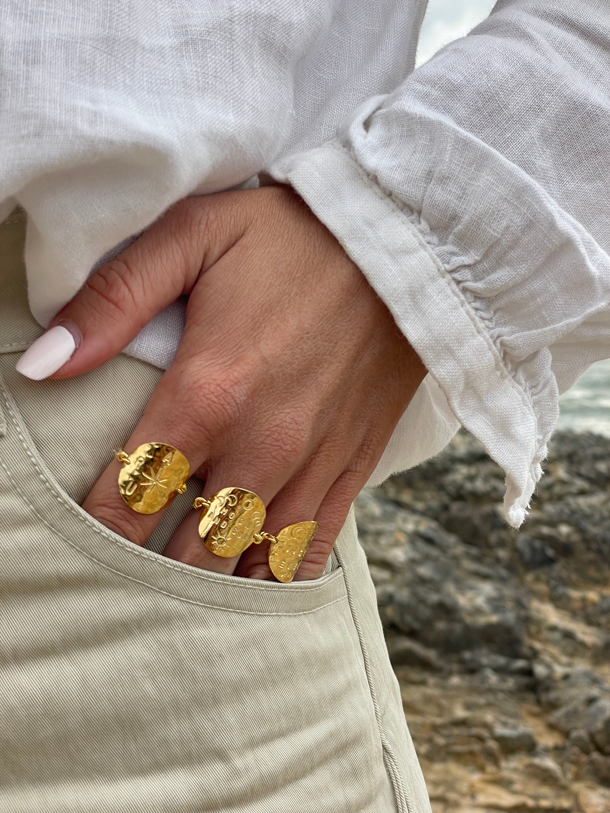 Cette bague fait partie d’une collection de cinq modèles, tous créés à Bali, dans un petit atelier où je façonne d’abord les prototypes moi-même : courbure du médaillon, profondeur du martelage, équilibre des gravures…
