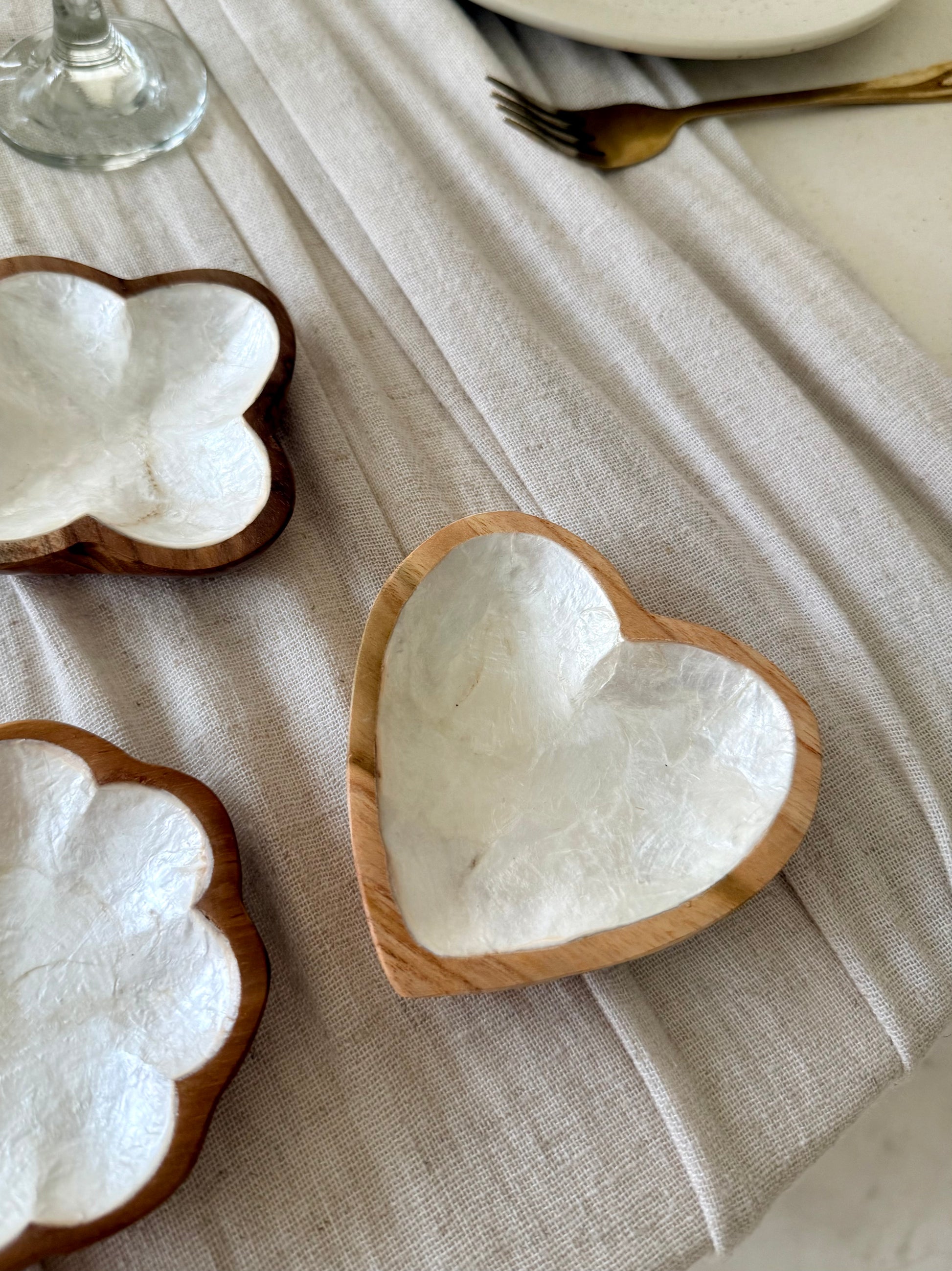 Façonnée à la main à Bali, dans la région d’Ubud, cette coupelle en forme de cœur allie l’élégance du bois de manguier à la délicatesse de la nacre naturelle.