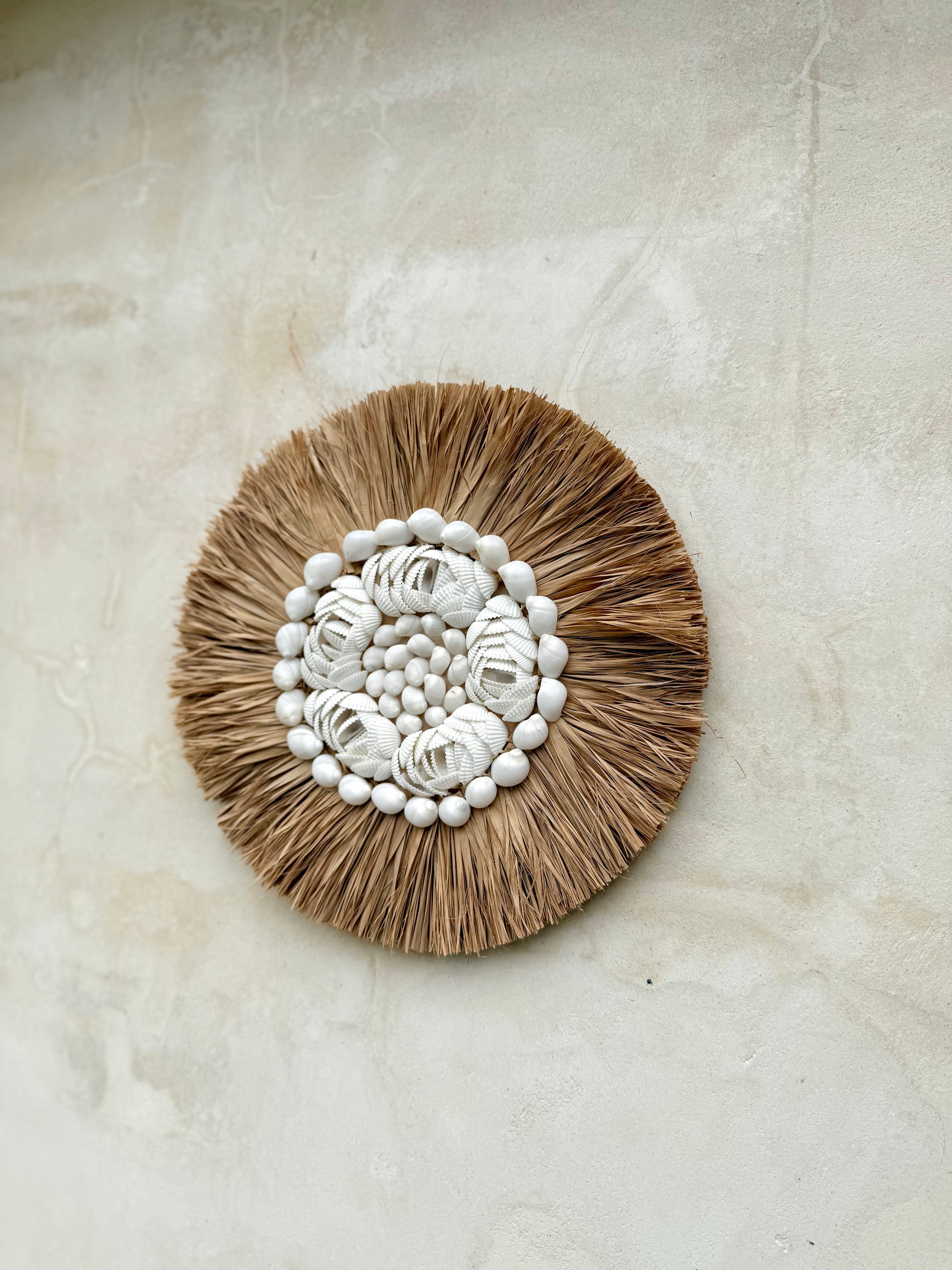 Décoration murale en coquillages et plantes aquatiques séchées – pièce artisanale bohème de Bali