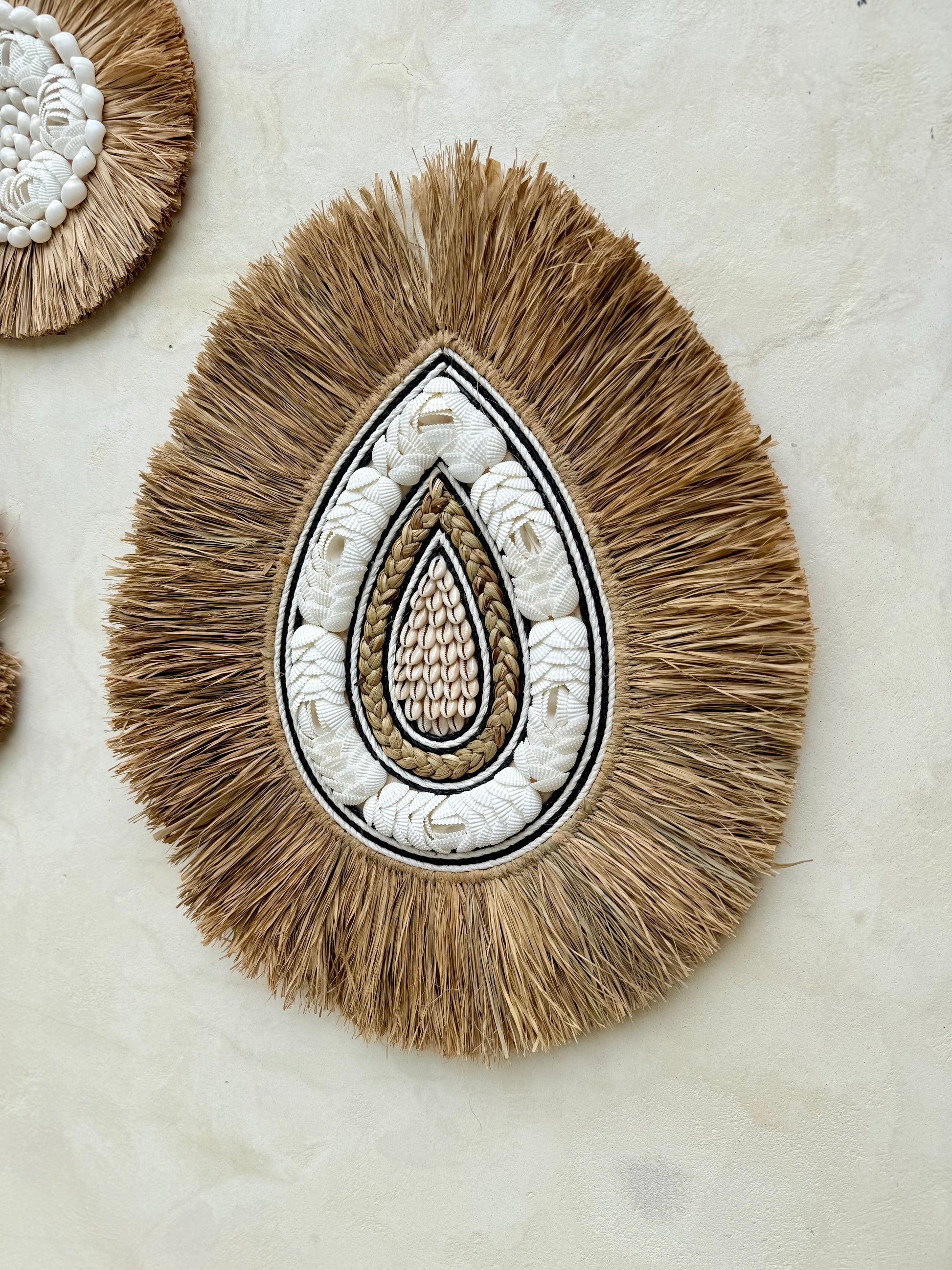 Décoration murale goutte d’eau en coquillages et corde noire – création artisanale bohème de Bali