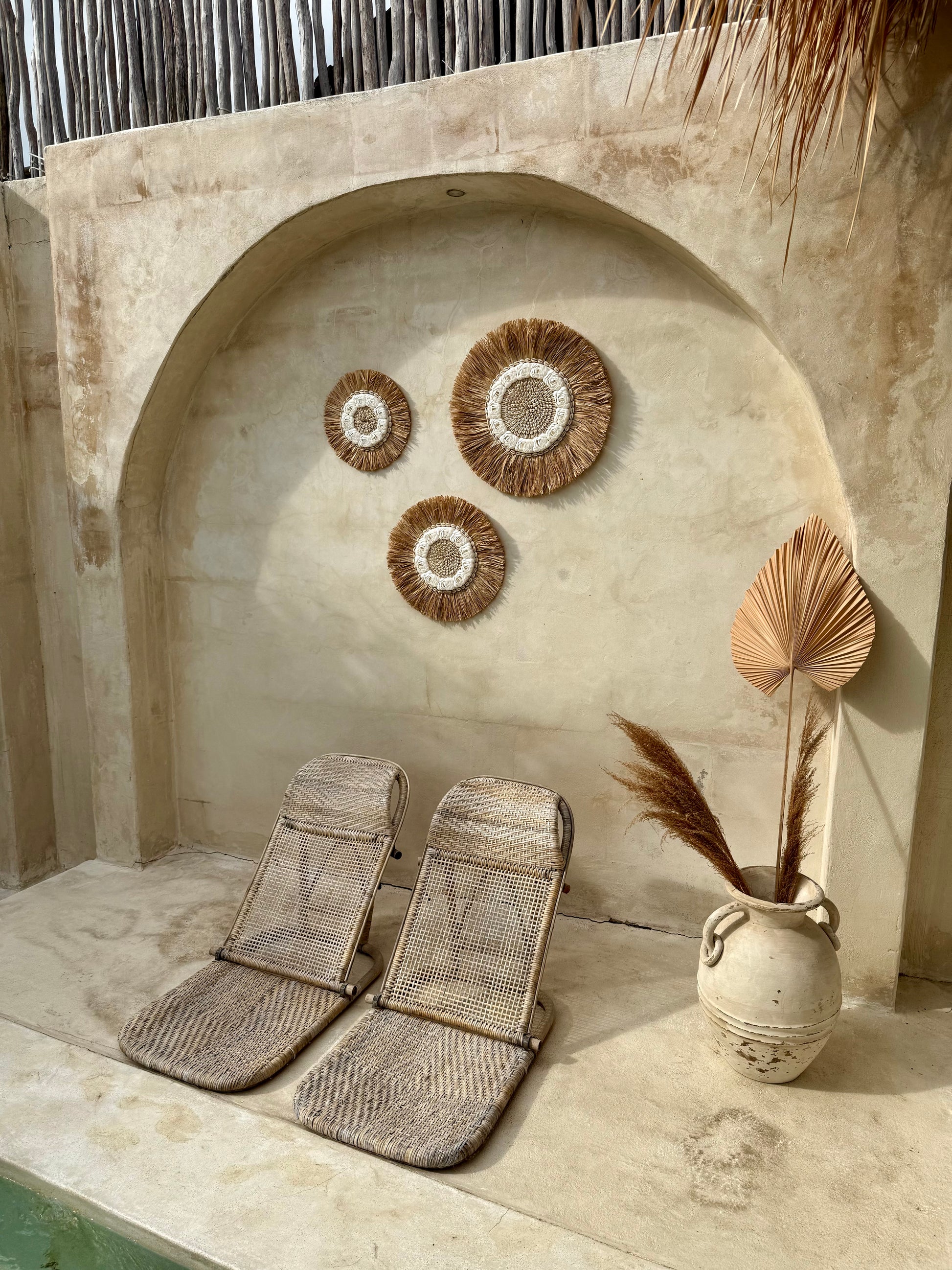 Une dernière ligne de coquillages Cauri vient souligner la composition avant de laisser place à de jolies franges en plantes aquatiques séchées, qui adoucissent la structure et donnent un rendu harmonieux.