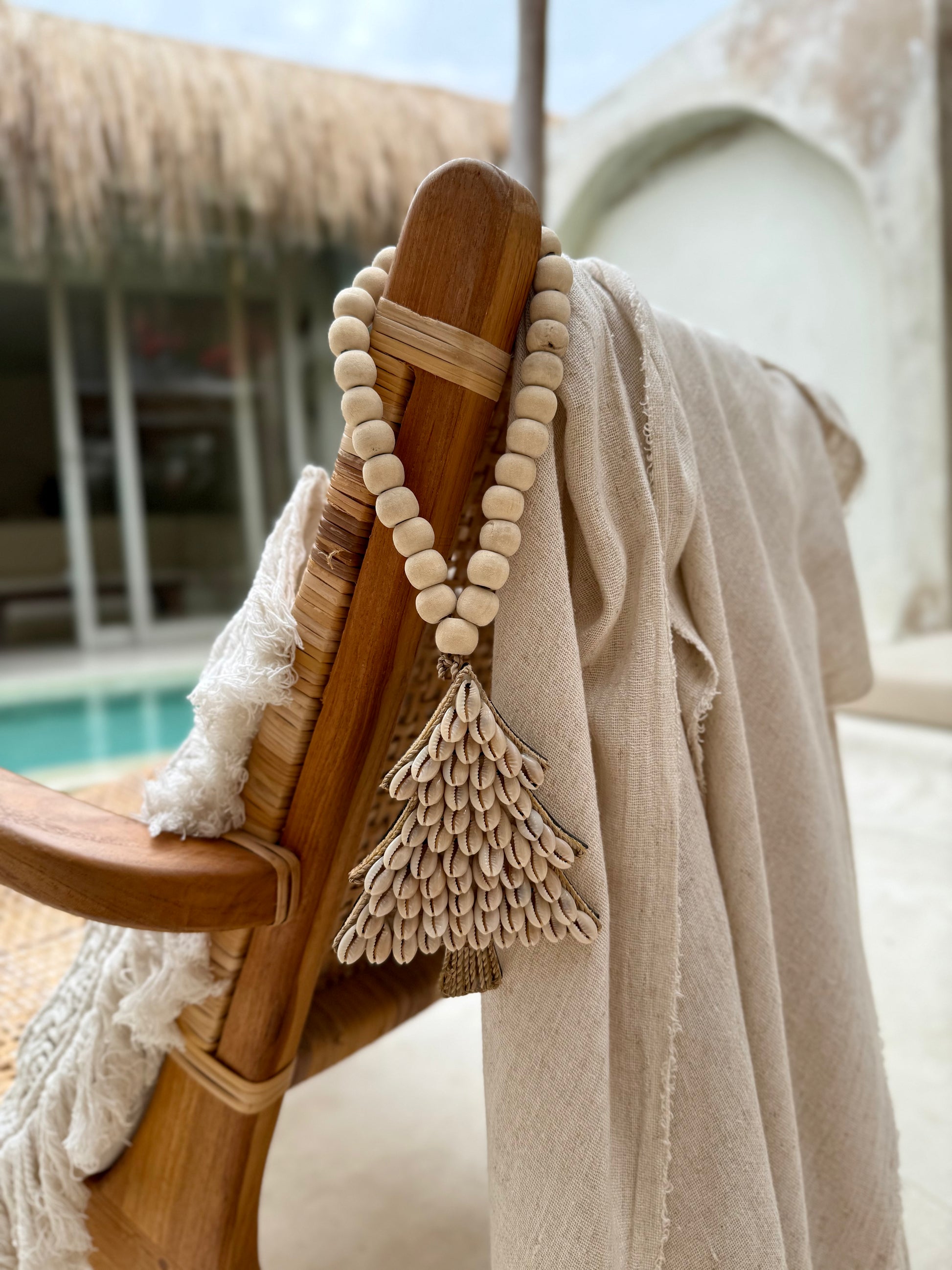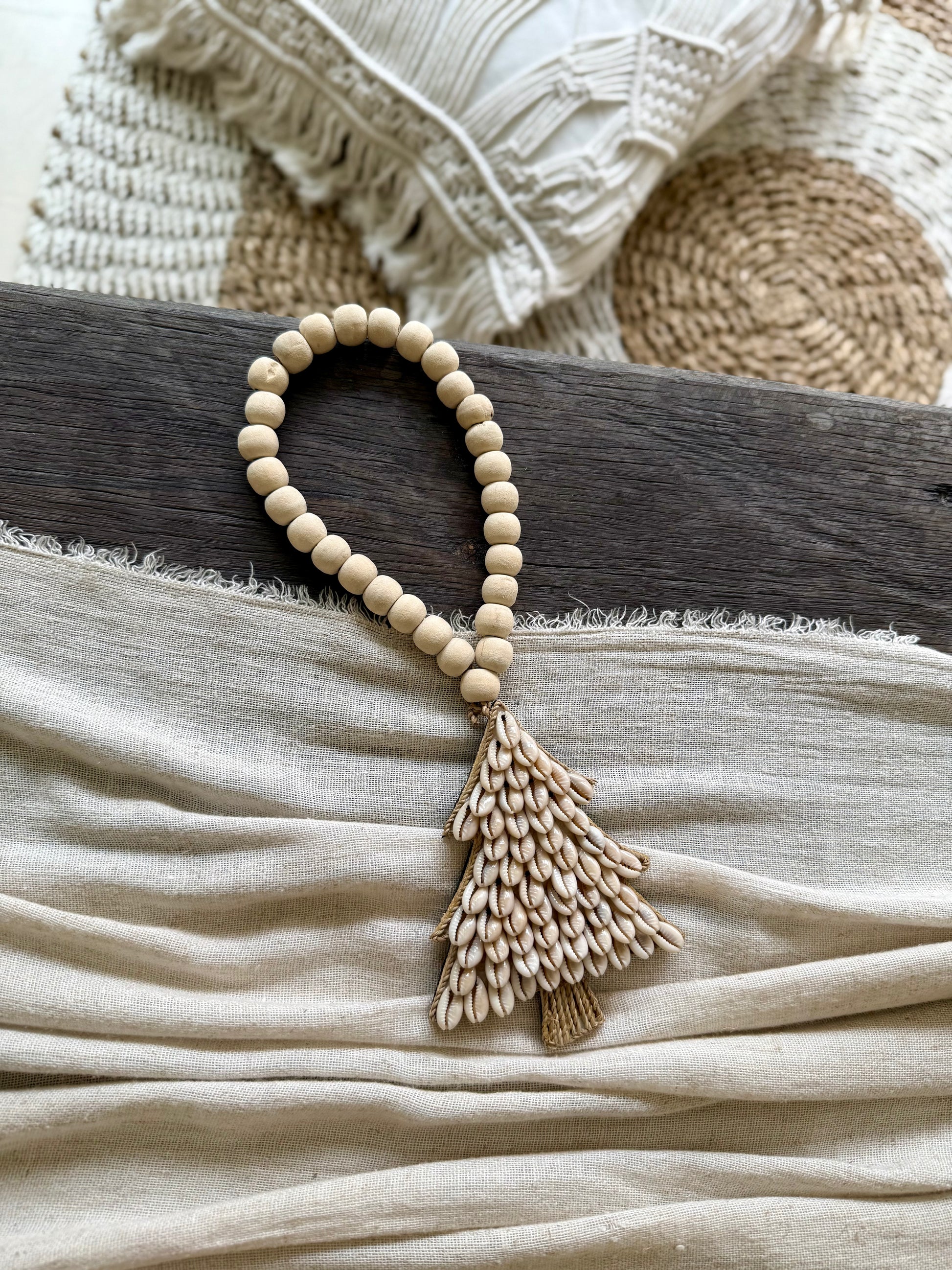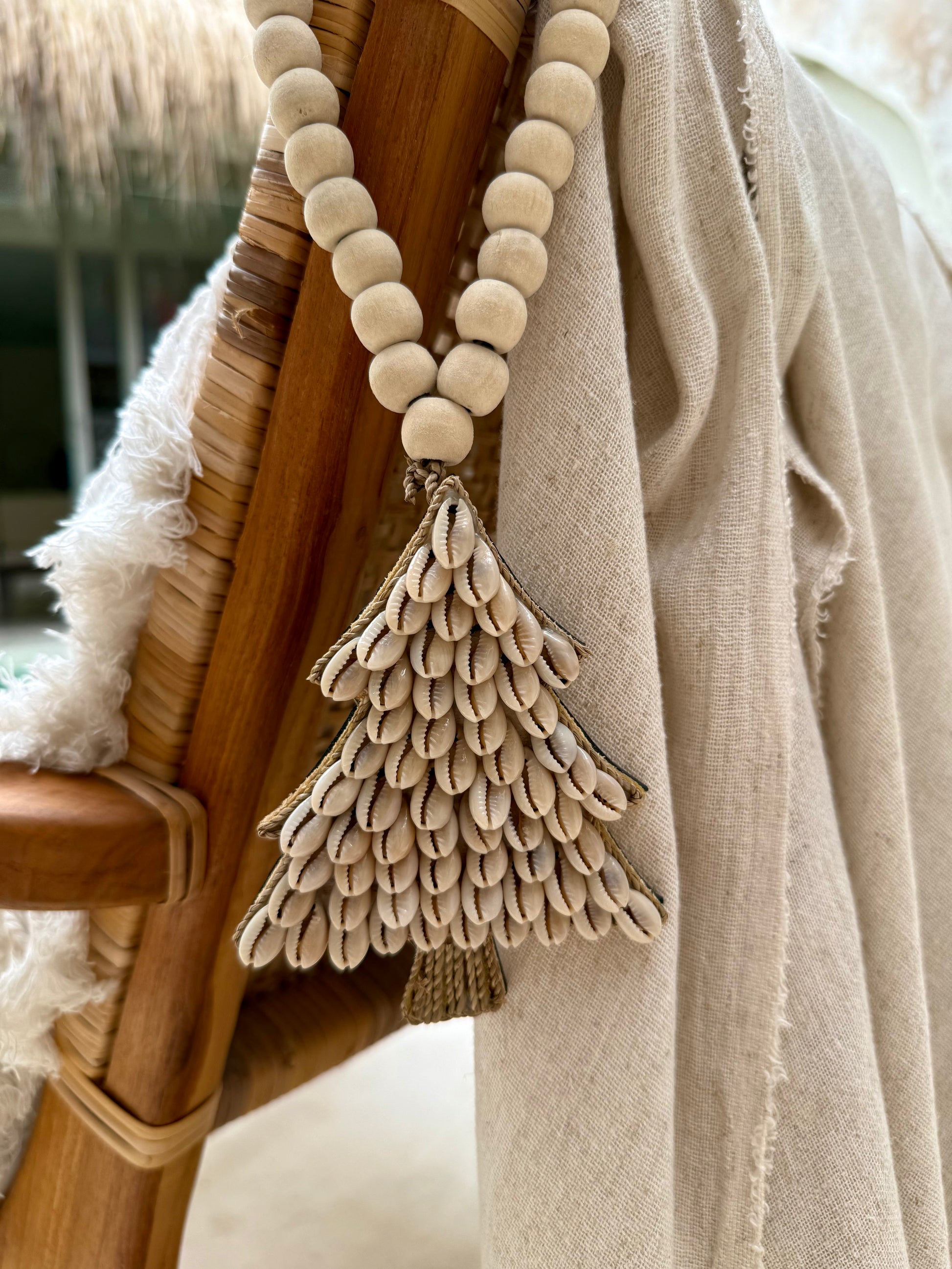Son design unique est réalisé à partir de coquillages cauri soigneusement assemblés pour former la silhouette du sapin, reposant sur un pied en cordelette naturelle.