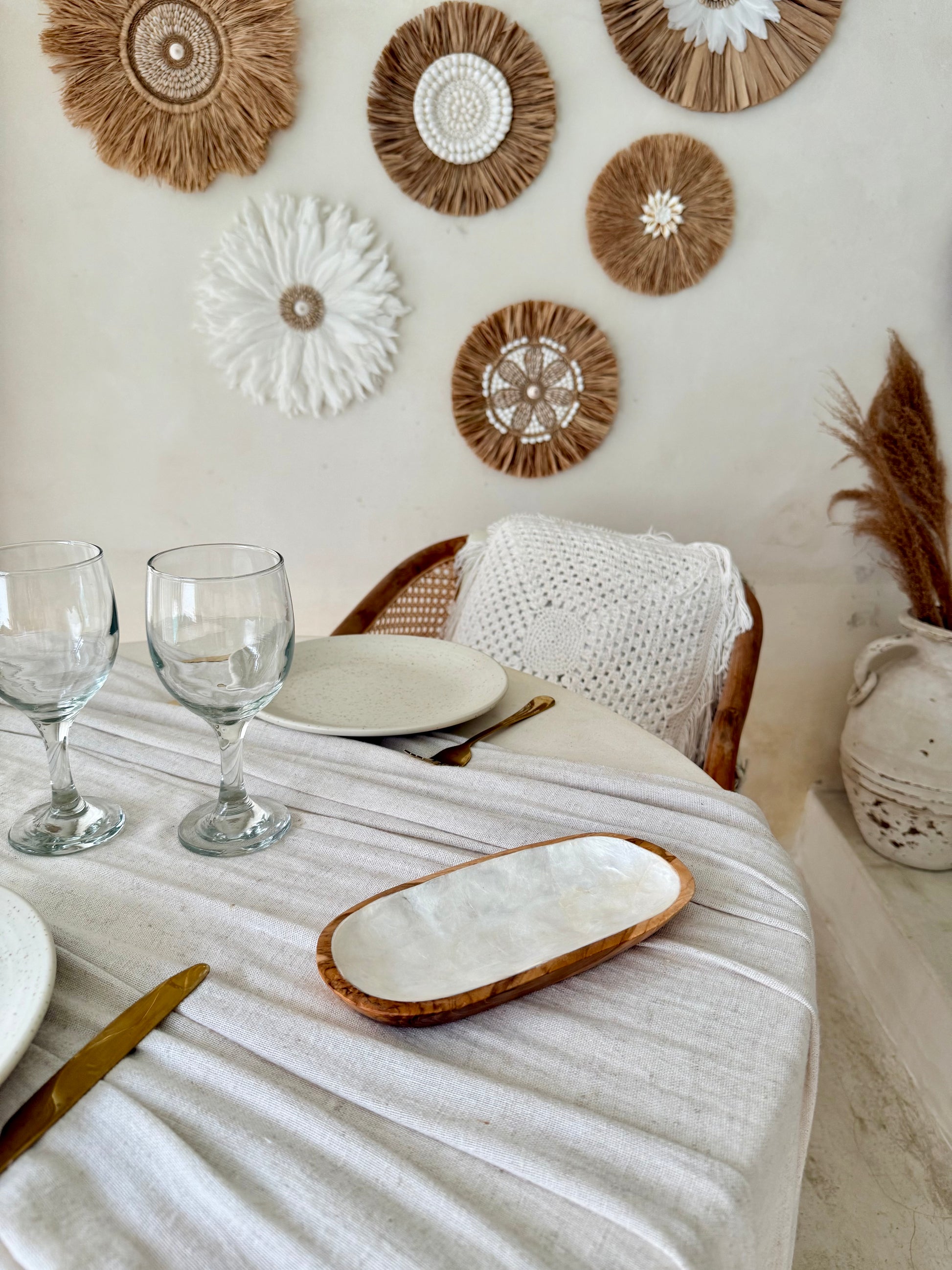 Le mélange du bois chaud et de la nacre lumineuse crée un contraste raffiné, parfait pour sublimer une décoration bohème, naturelle ou bord de mer.