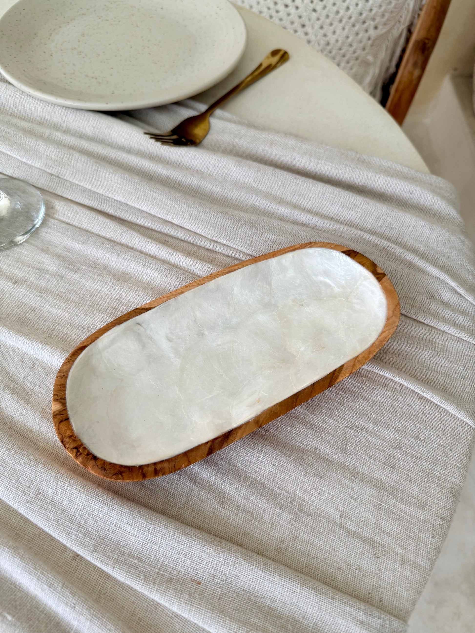 Façonnée à la main à Bali, dans la région d’Ubud, cette grande coupelle ovale en bois de manguier et nacre naturelle séduit par son design épuré et ses reflets délicats.