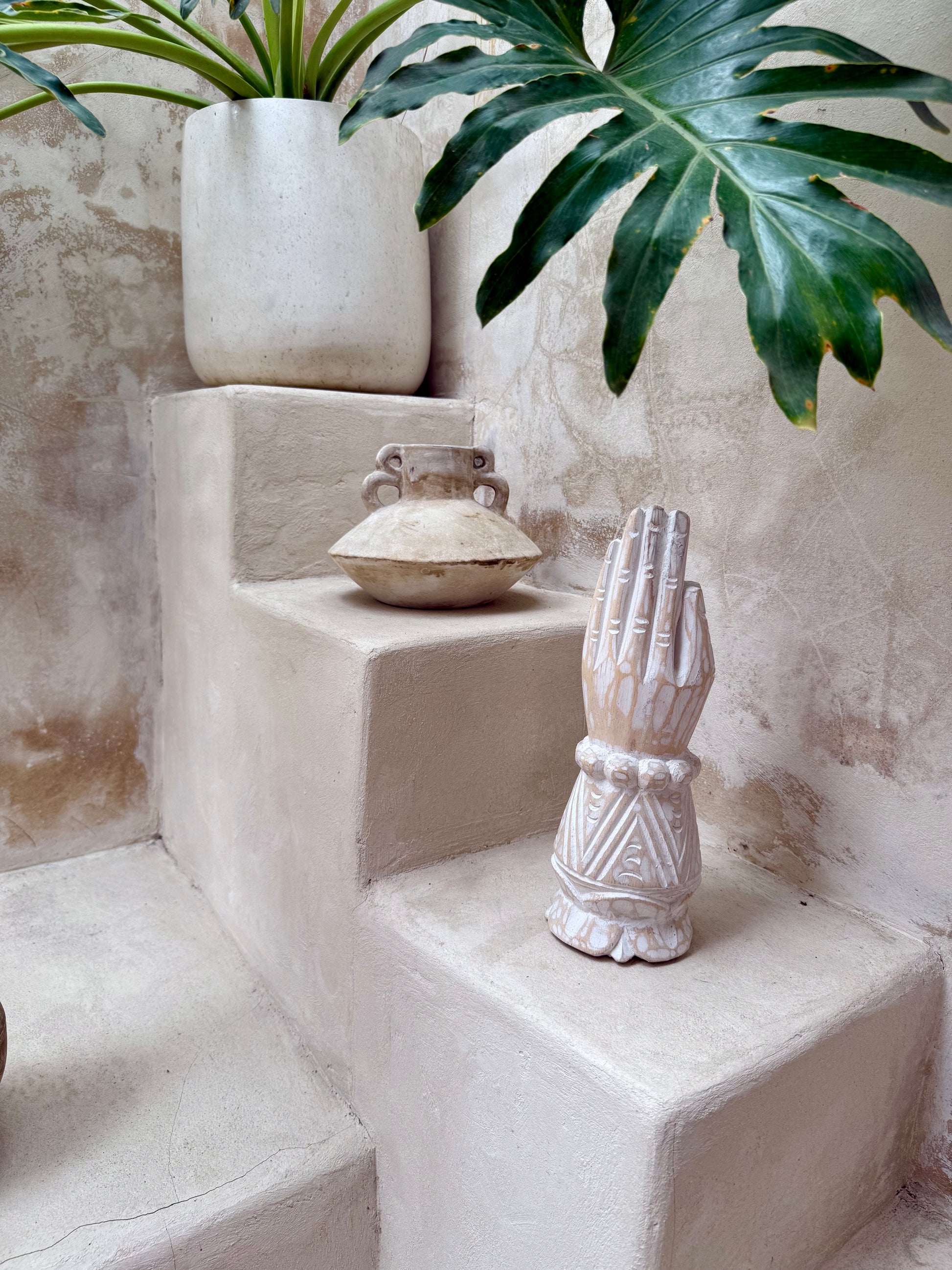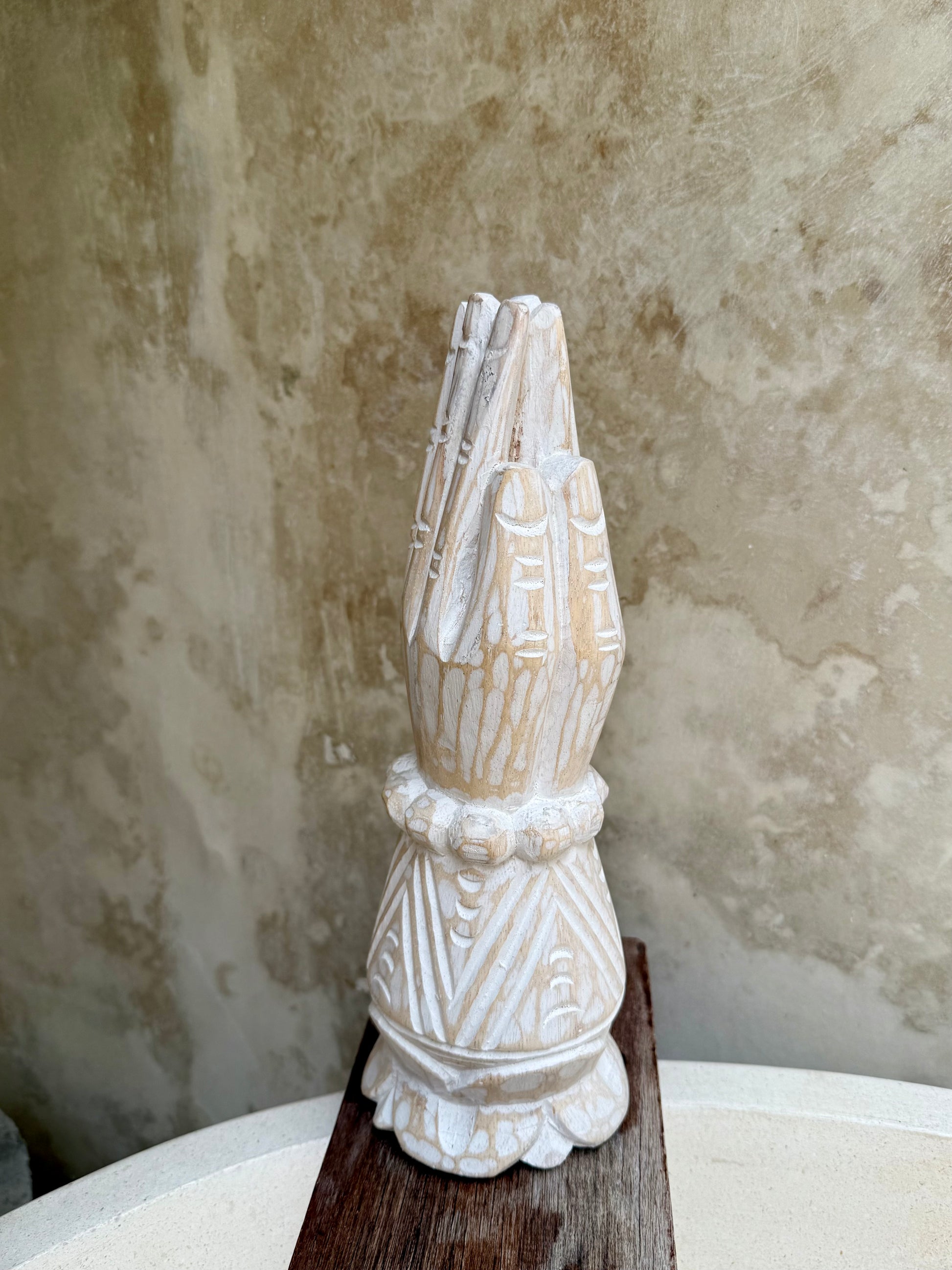 Apportez une touche spirituelle et apaisante à votre intérieur avec cette main en prière sculptée dans le bois, une pièce emblématique du savoir-faire balinais.
