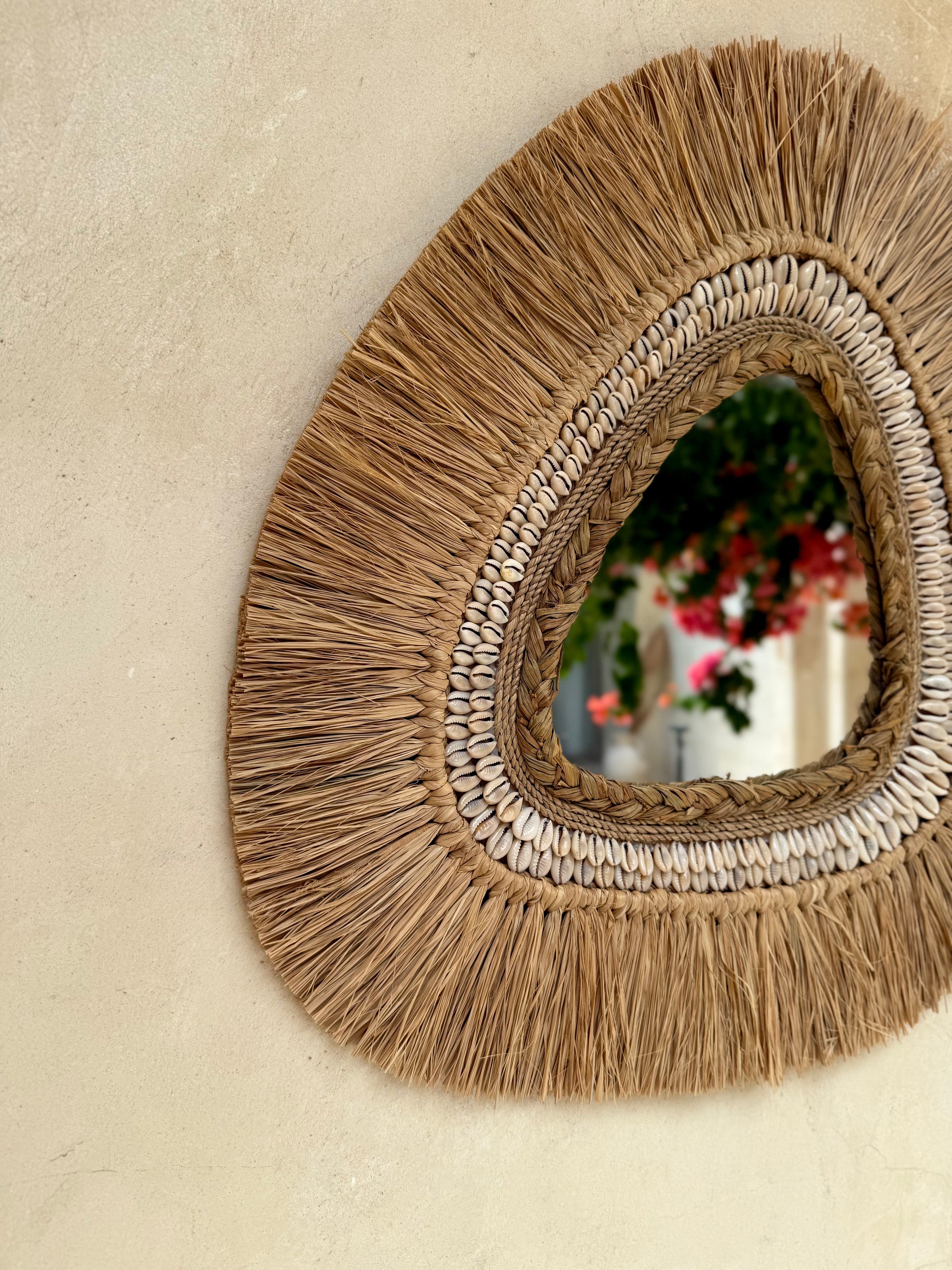 Miroir mural asymétrique en coquillages cauri et fibres naturelles – décoration artisanale bohème de Bali