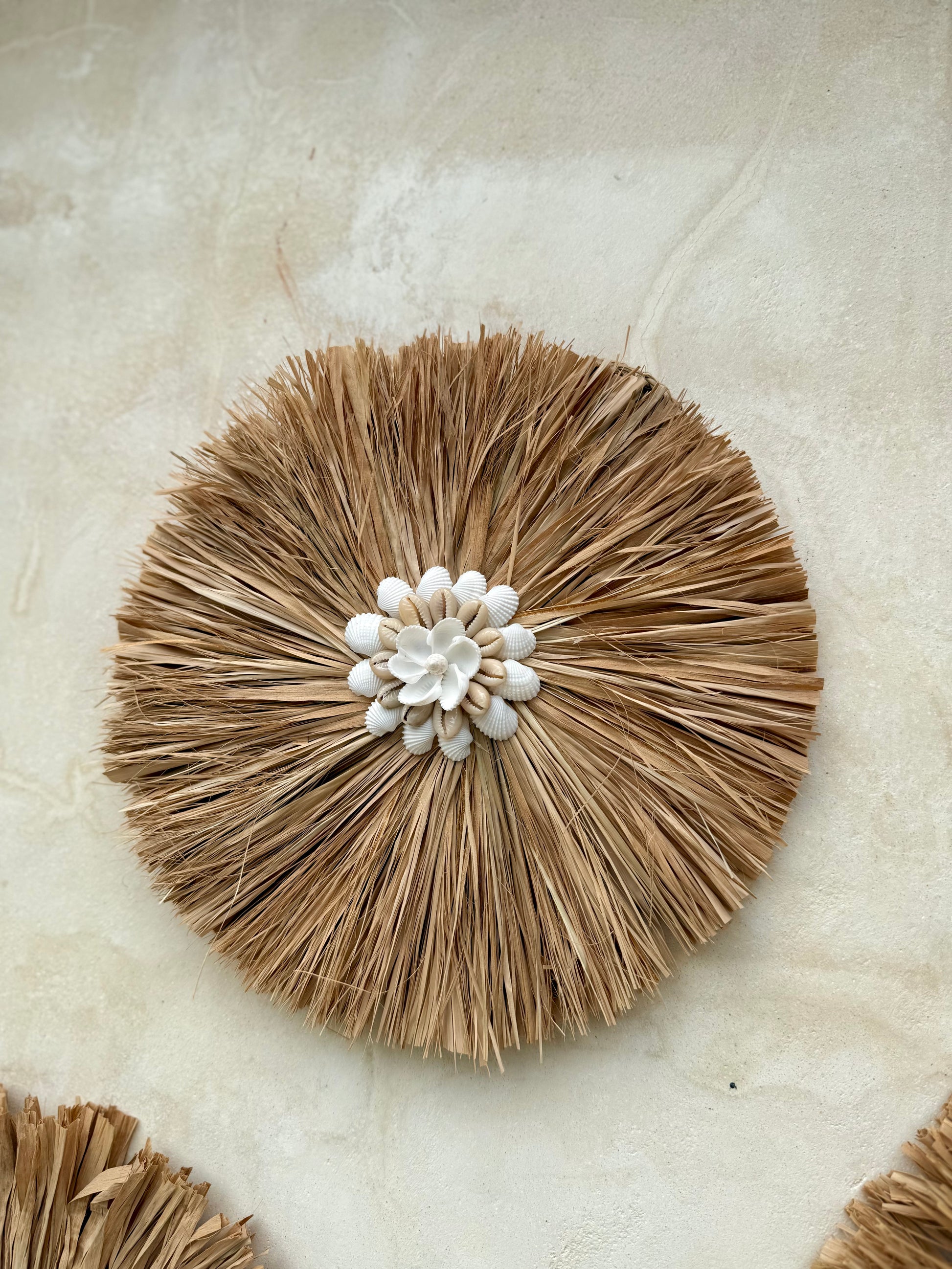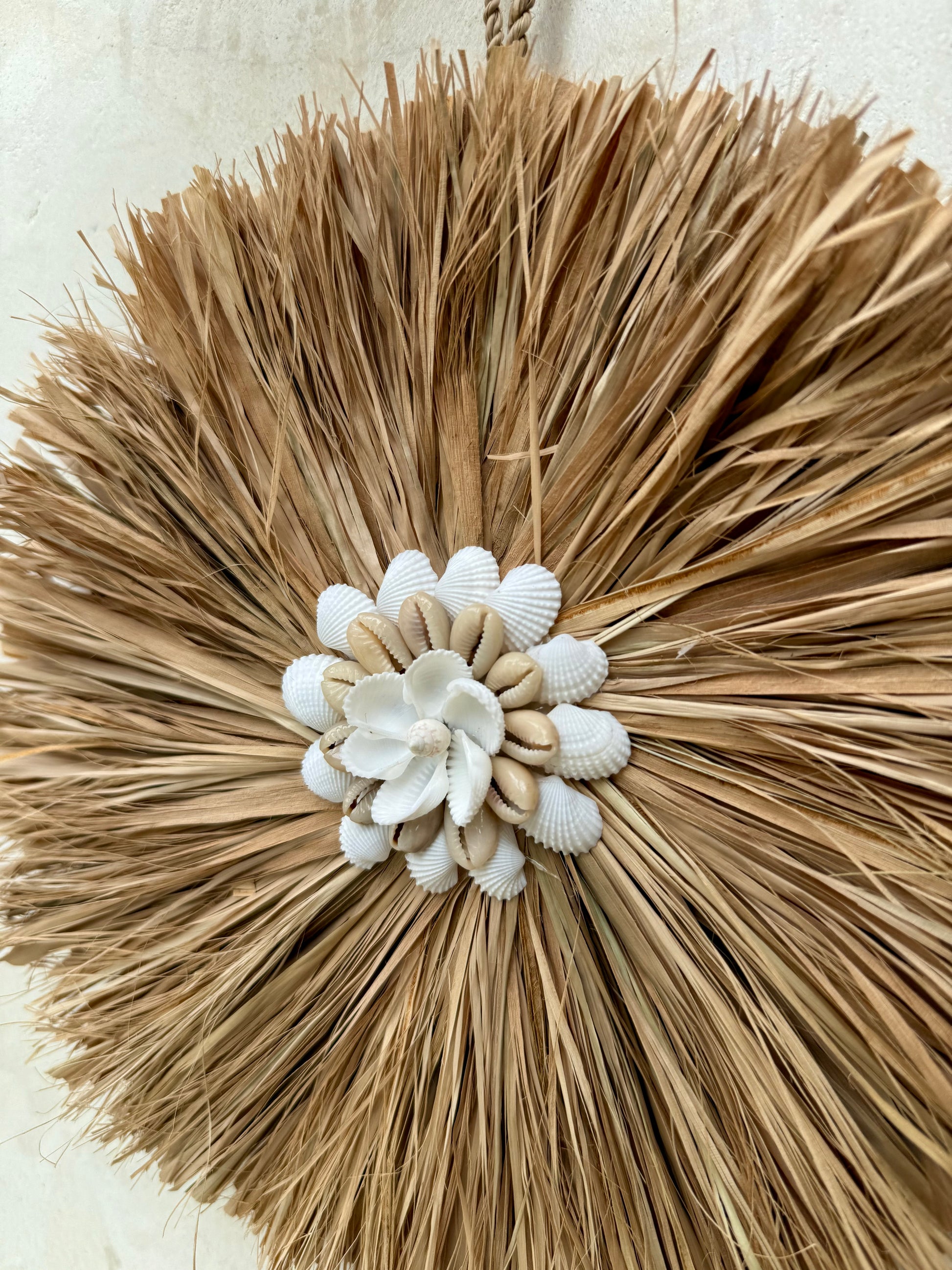 Rond mural en coquillages et plantes aquatiques séchées – décoration bohème artisanale
