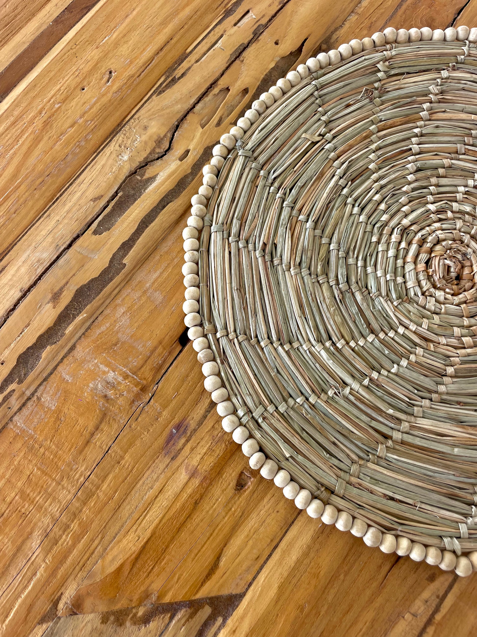 Set de table en fibres naturelles et perles de bois – esprit bohème et raffiné