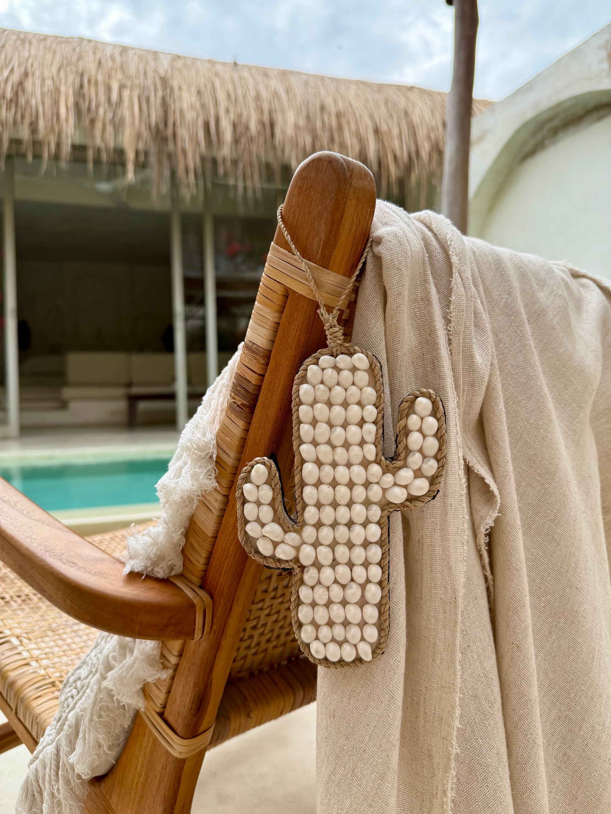 Le cactus est composé de petits coquillages blancs et de cordelette naturelle, finement tressés pour former une pièce douce et pleine de charme.